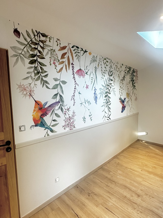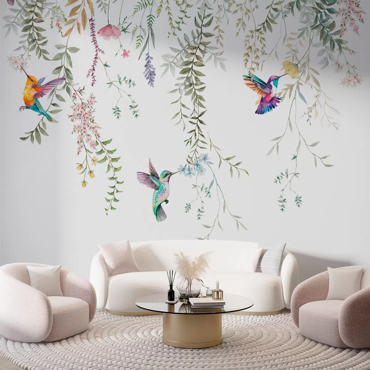 Murais de parede Flores e folhas penduradas e lindos beija-flores Nr. w00660