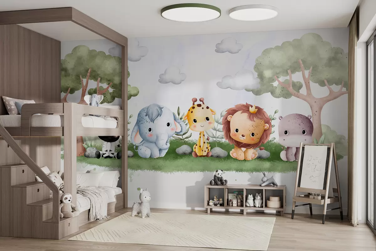 Murais de parede Um grupo de animais fofos de desenho animado sentados em um campo gramado com árvores e nuvens ao fundo Nr. w00705