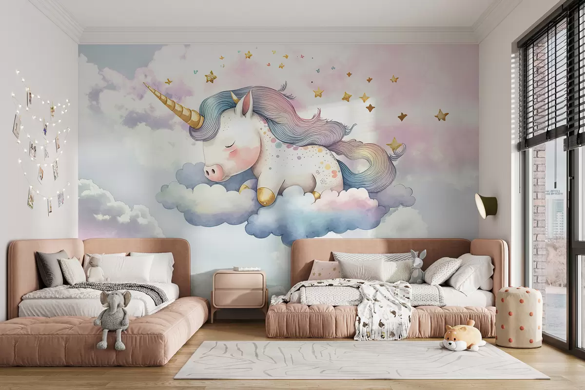 Murais de parede Um unicórnio branco com crina e cauda de arco-íris descansando em uma nuvem em um céu em tons pastéis com estrelas Nr. w00799