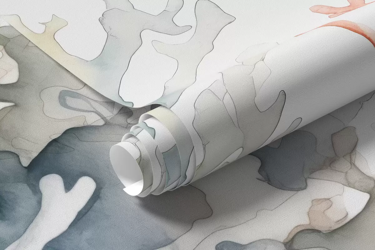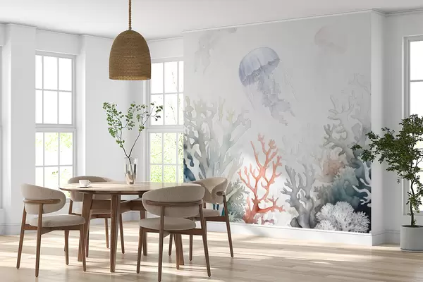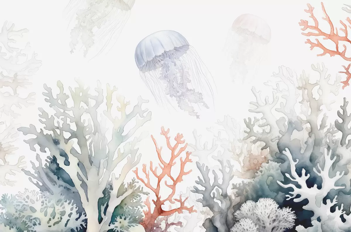 Murais de parede Corais marinhos, água-viva nadam, aquarela, cinza, azul, vermelho Nr. w00819