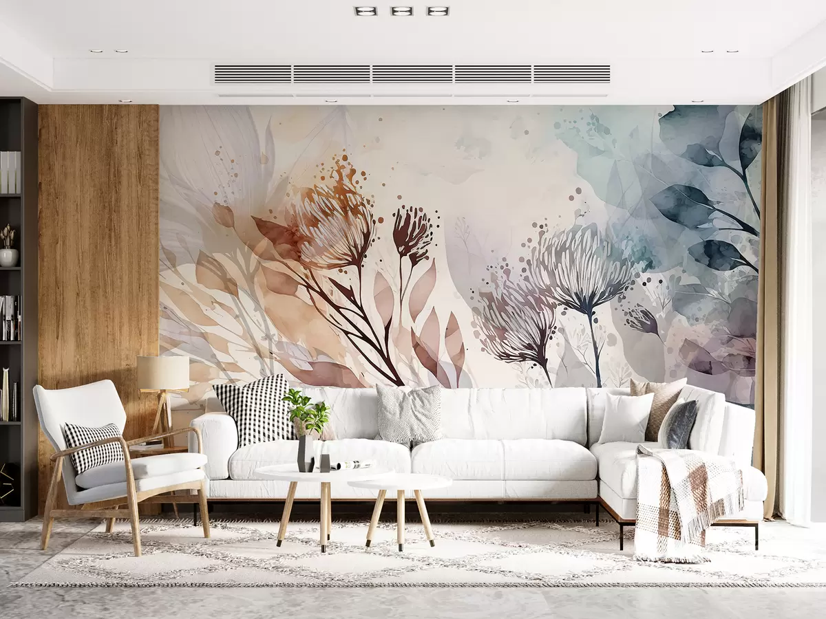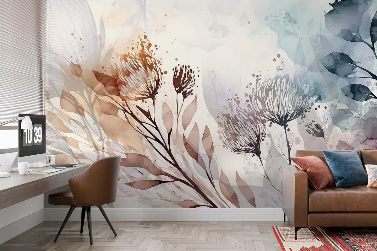 Murais de parede Abstrato floral delicado, flores estilizadas e elementos de formas de plantas em aquarela de tons suaves e terrosos Nr. w00898