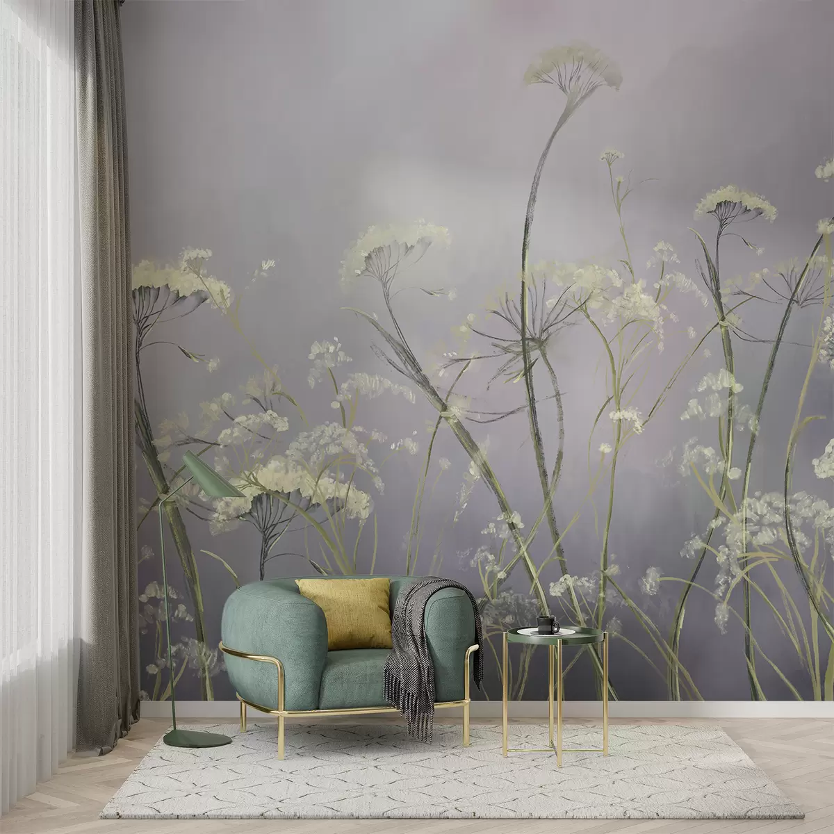 Murais de parede Flores silvestres brancas em um campo enevoado com fundo cinza suave e desfocado Nr. w00903