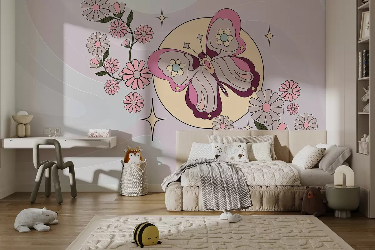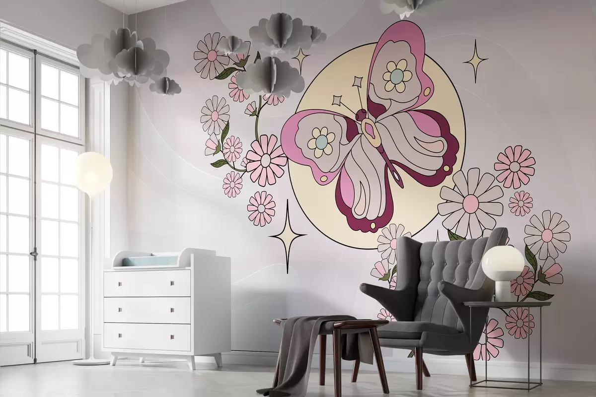 Murais de parede paper-moger gant ur balafenn roz war ur foñs gris-roz sklaer e-touez bleunioù en ur stil simpl evit ur gambr plac'h Nr. w00985
