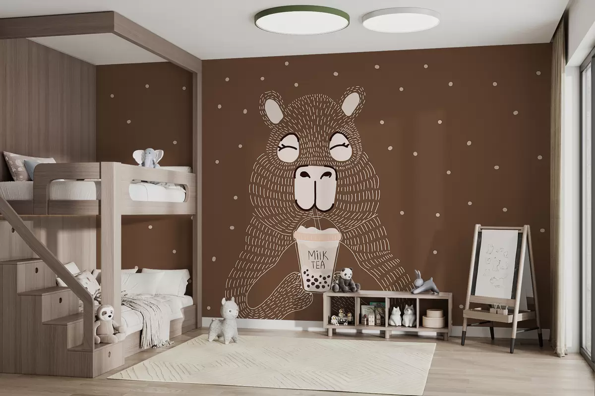 Murais de parede Capivara grande e fofa com camiseta com bolhas em estilo de ponto minimalista em um fundo marrom pontilhado Nr. w01122v2