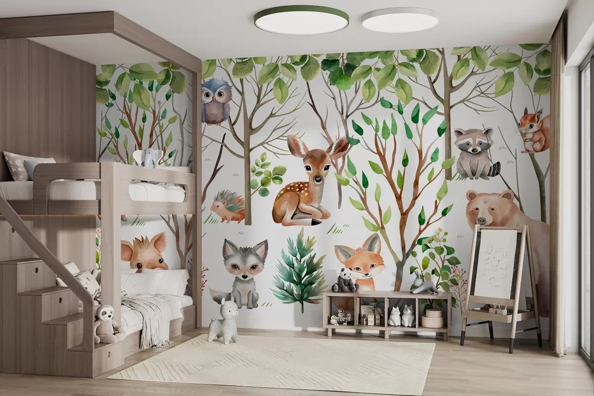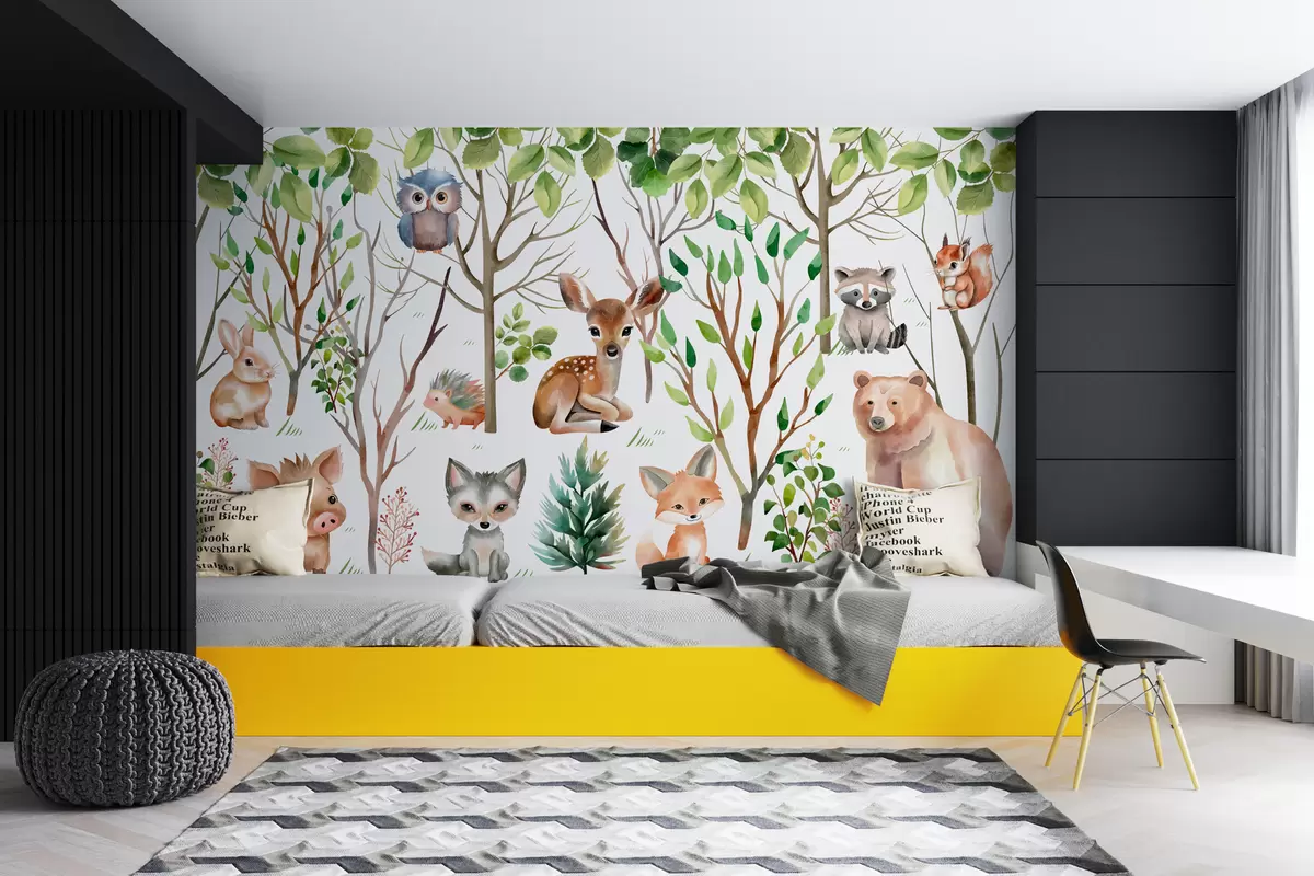 Murais de parede Papel de parede infantil com animais da floresta. Papel de parede colorido em um fundo branco Nr. w01127