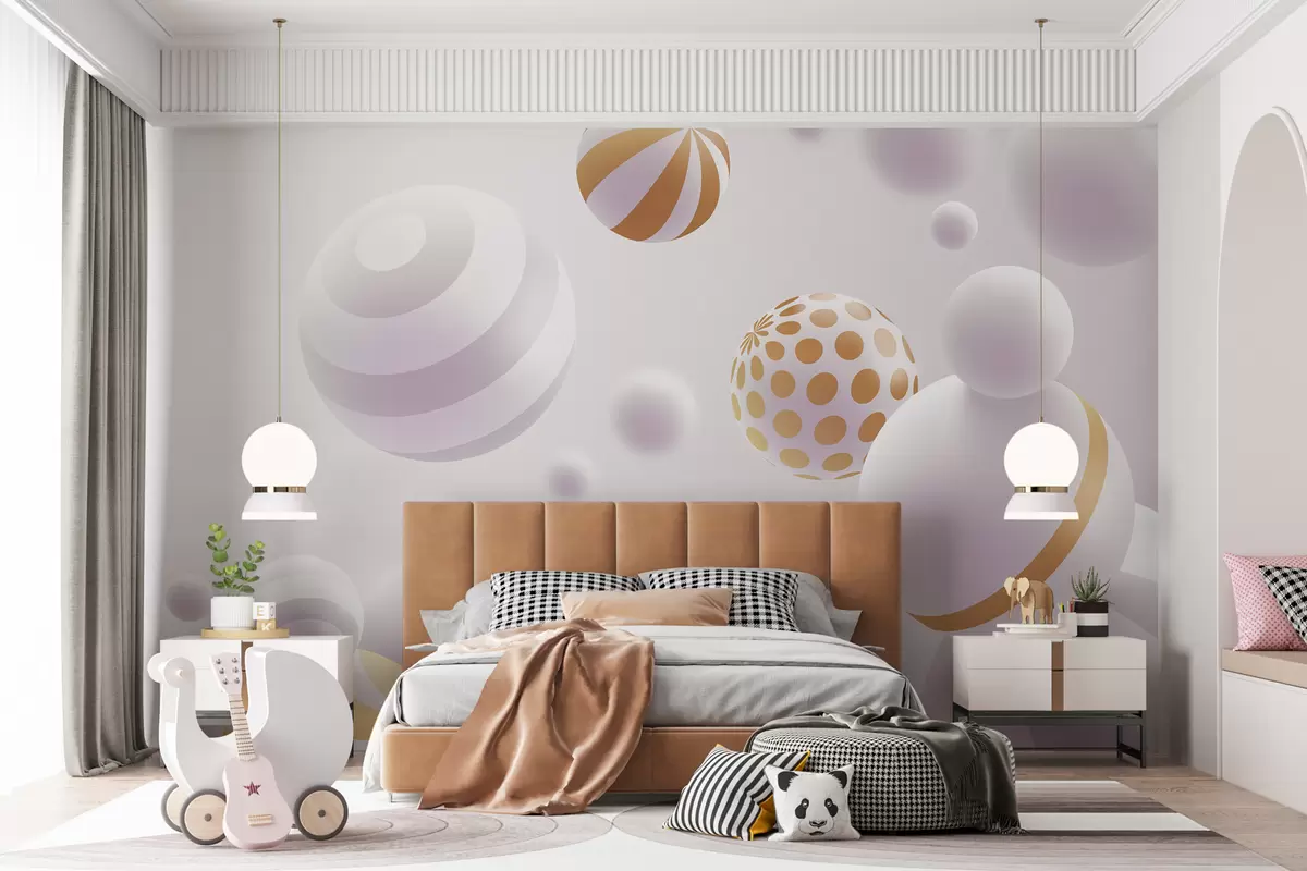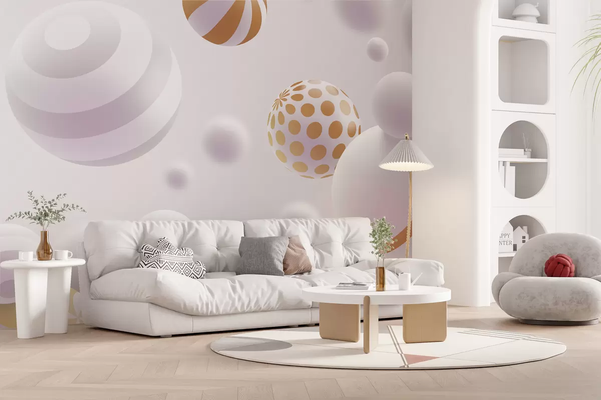 Murais de parede Esferas voadoras volumétricas em estilo 3D em tons de cinza claro com detalhes em laranja Nr. w01148