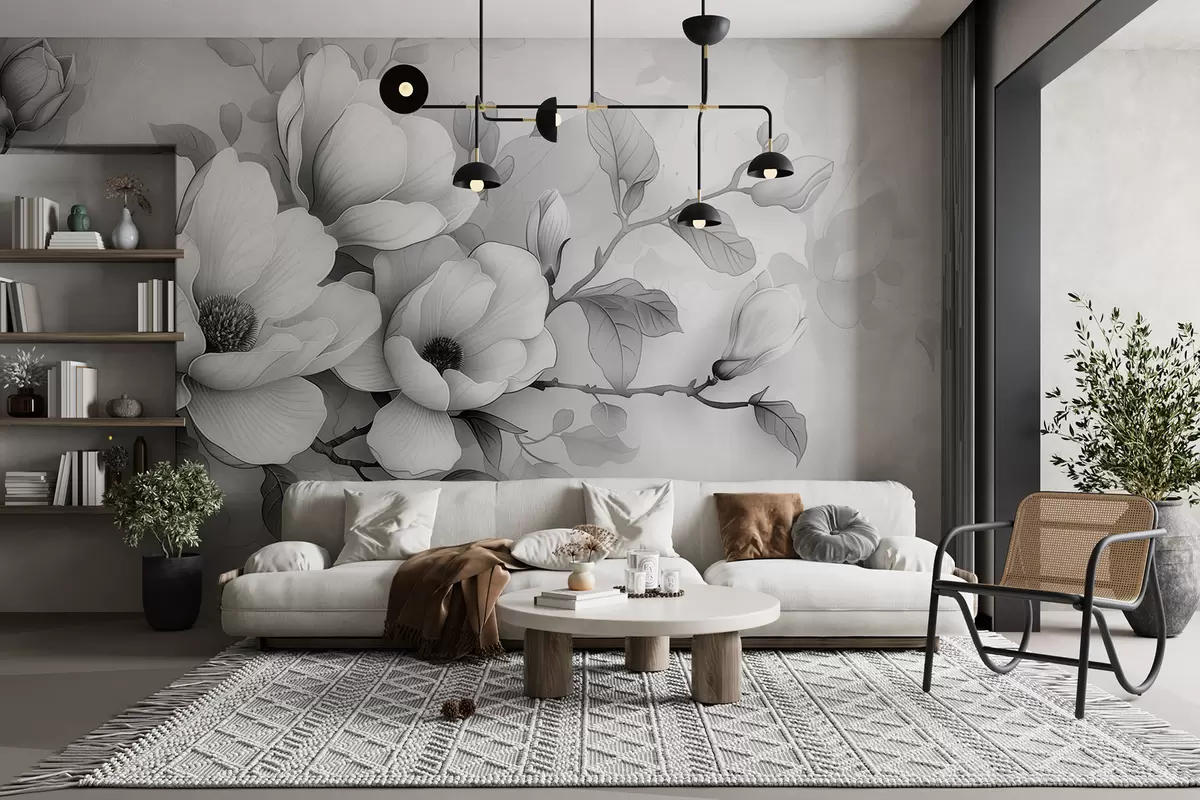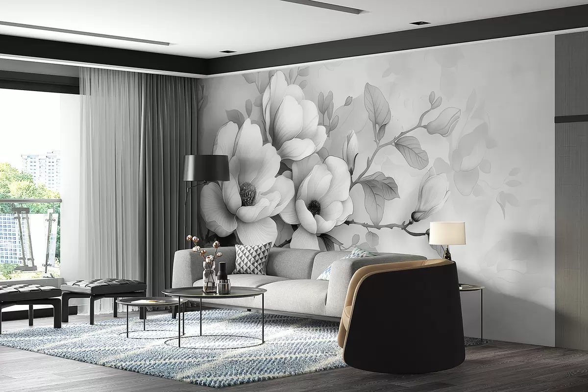 murais de parede Uma ilustração em preto e branco de uma magnólia em um fundo cinza w01277