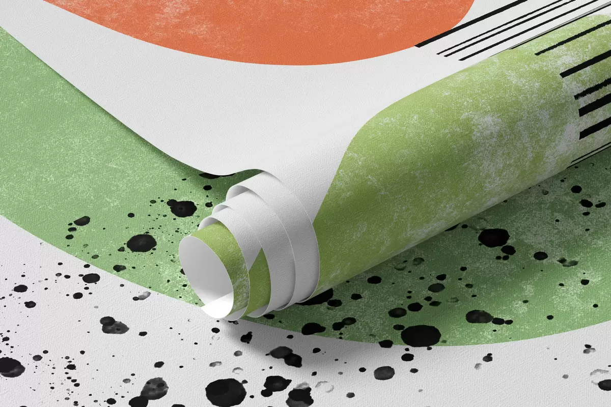 Murais de parede Abstração Boho, manchas de textura, linhas curvas, folhas tropicais, manchas de tinta, cor preta, verde e vermelha Nr. w01298