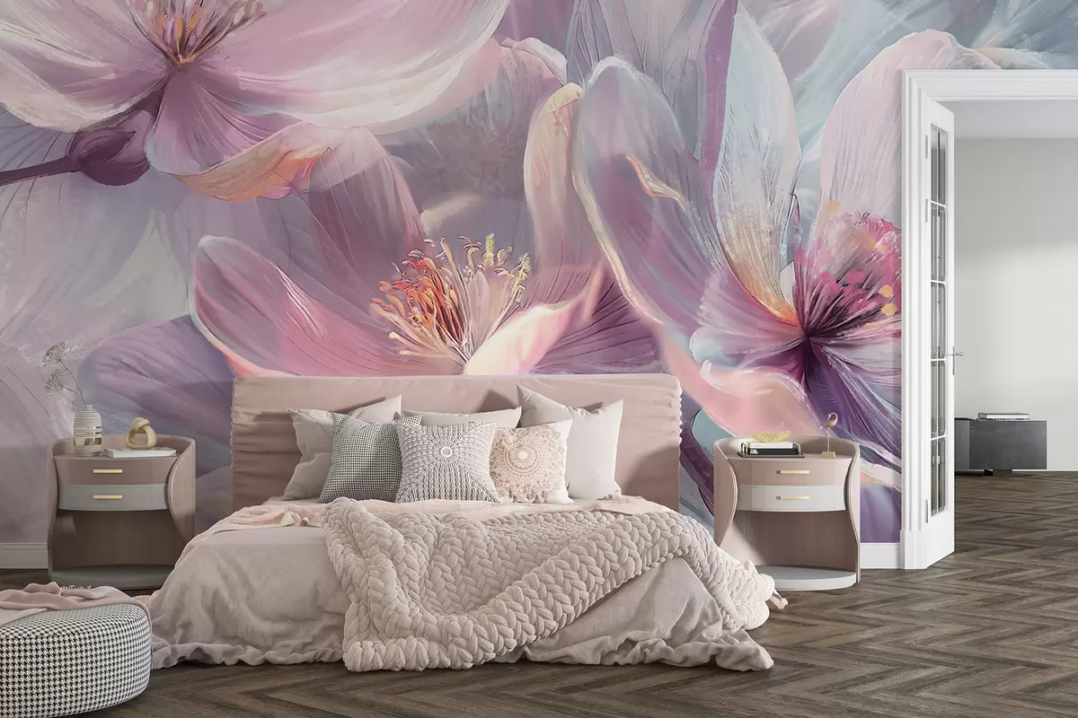Murais de parede Delicadas flores pastel transparentes, rosa claro, rosa e brancas, com fundo macio e desfocado Nr. w01307