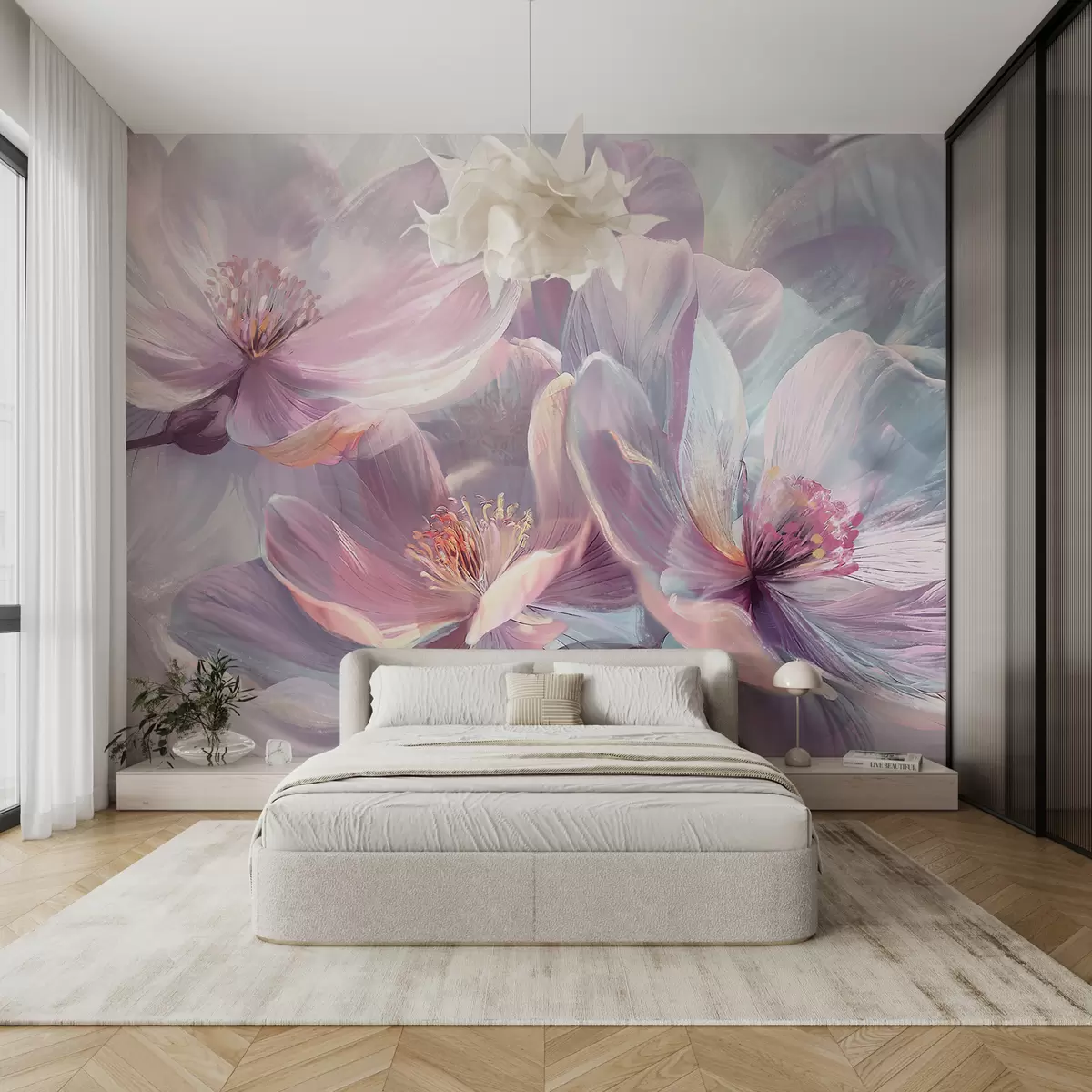 Murais de parede Delicadas flores pastel transparentes, rosa claro, rosa e brancas, com fundo macio e desfocado Nr. w01307
