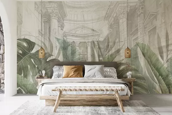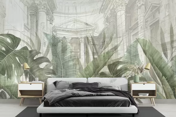 Murais de parede Um grande desenho de colunas arquitetônicas de mármore ornamentadas e exuberantes plantas verdes tropicais Nr. w01311