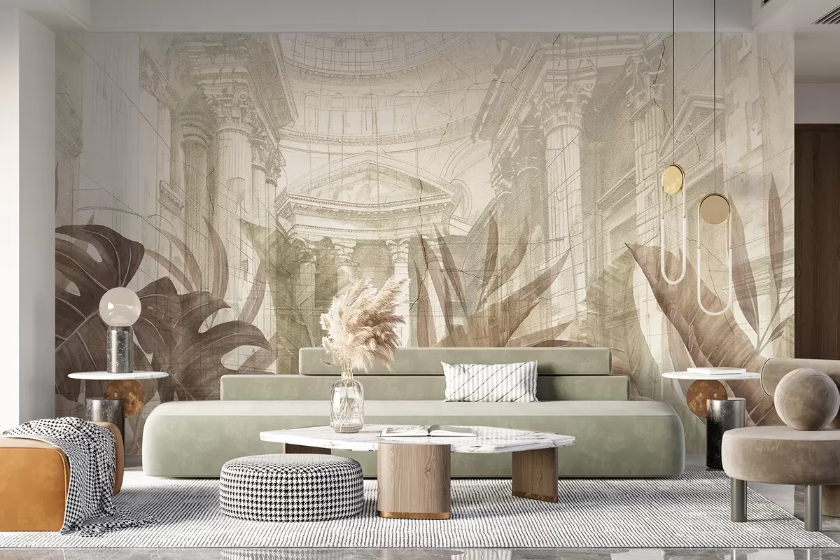 Murais de parede Um grande desenho de colunas arquitetônicas de mármore ornamentadas e exuberantes plantas tropicais em sépia Nr. w01311v1