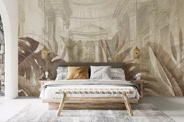 Murais de parede Um grande desenho de colunas arquitetônicas de mármore ornamentadas e exuberantes plantas tropicais em sépia Nr. w01311v1