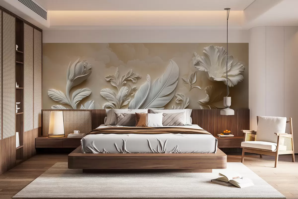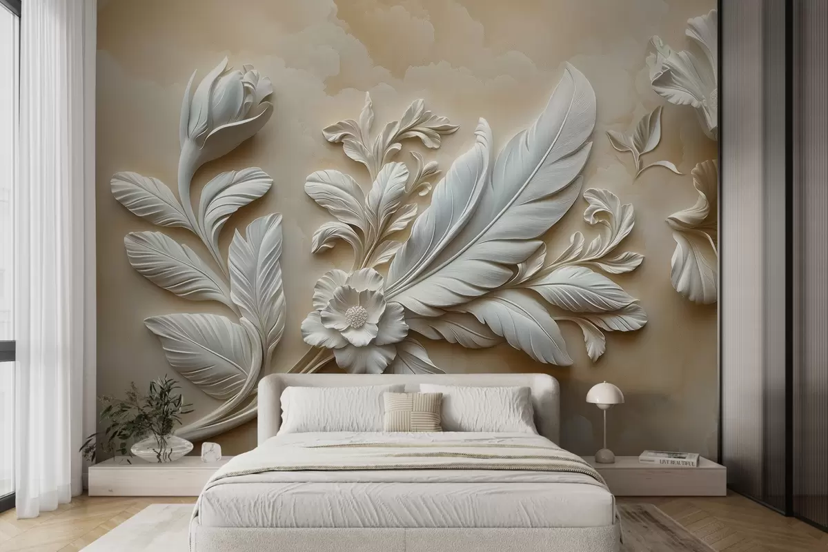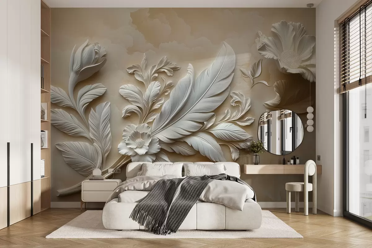 Murais de parede Graciosas flores em relevo com folhas e penas em tons de bege Nr. w01355