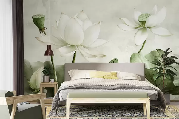Murais de parede Bleunioù lotus, dourlivadur, natur, kempenn bleunioù, delioù bras, livioù glas dous Nr. w01445v2