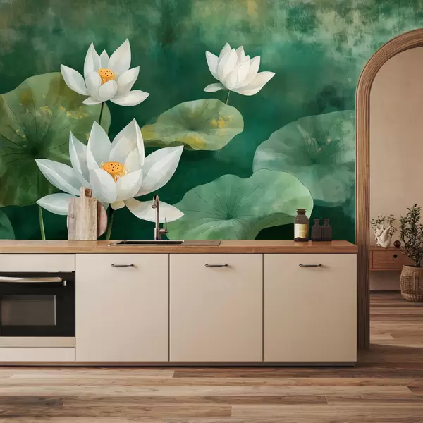 Murais de parede Lotusoù el lenn, brumenn, tresadenn dourliv, delioù bras, janglenn, paled livioù naturel Nr. w01452