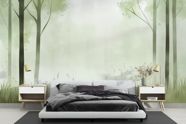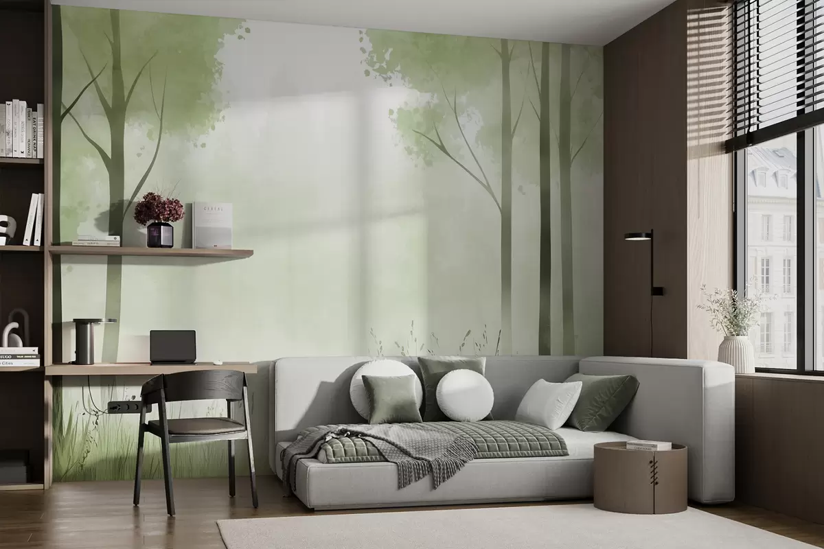 Murais de parede Floresta em aquarela, neblina, árvores, grama, paisagem natural, cor verde Nr. w01563v2