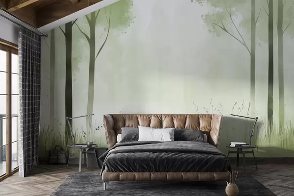 murais de parede Floresta em aquarela, neblina, árvores, grama, paisagem natural, cor verde w01563v2