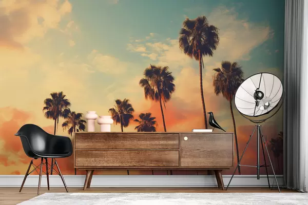 Murais de parede Palmeiras contra o céu ao pôr do sol, em tons de laranja e azul Nr. w01652
