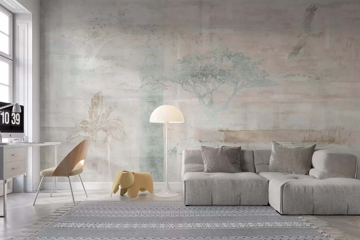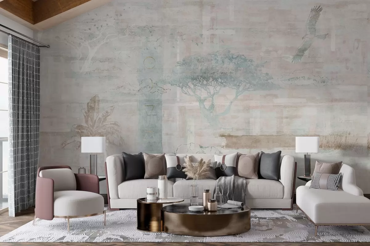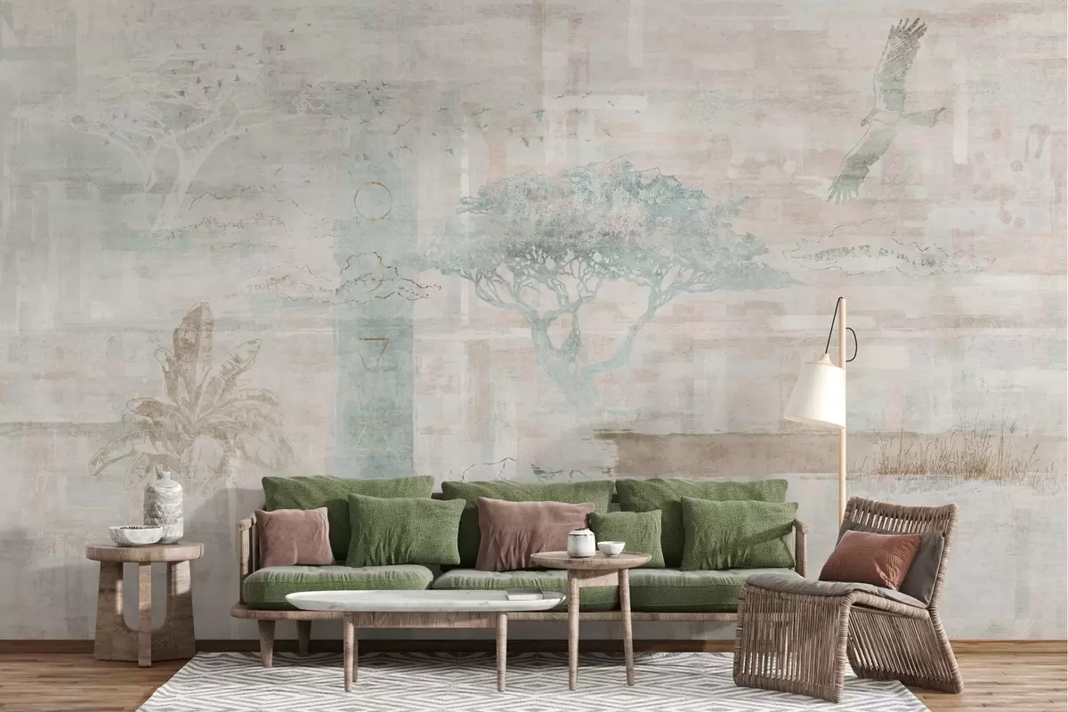 Murais de parede Design com efeito grunge vintage com árvores, águia e elementos geométricos Nr. w02130