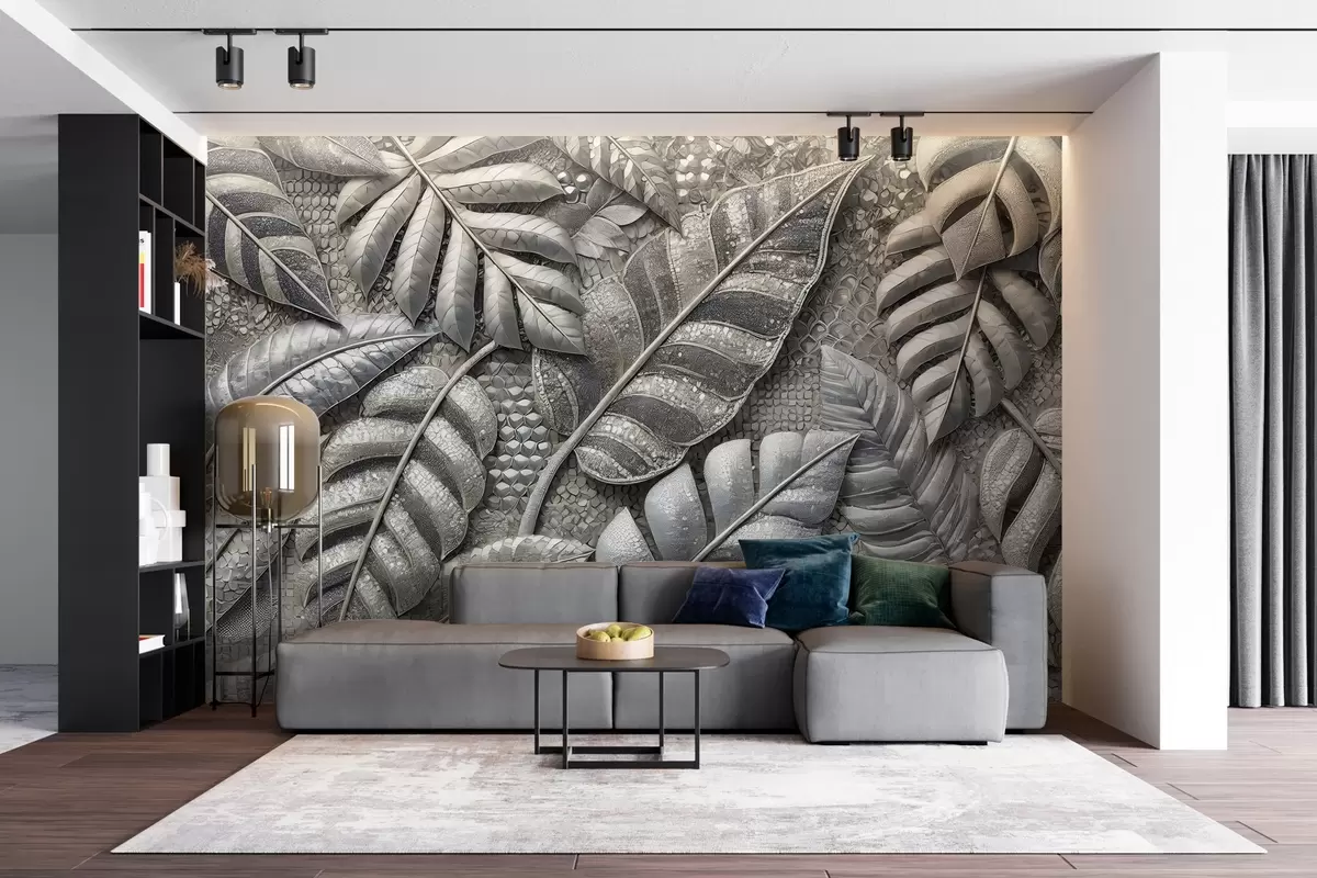 Murais de parede Grandes folhas tropicais em delicados tons de prata, em um estilo de mosaico texturizado Nr. w02135