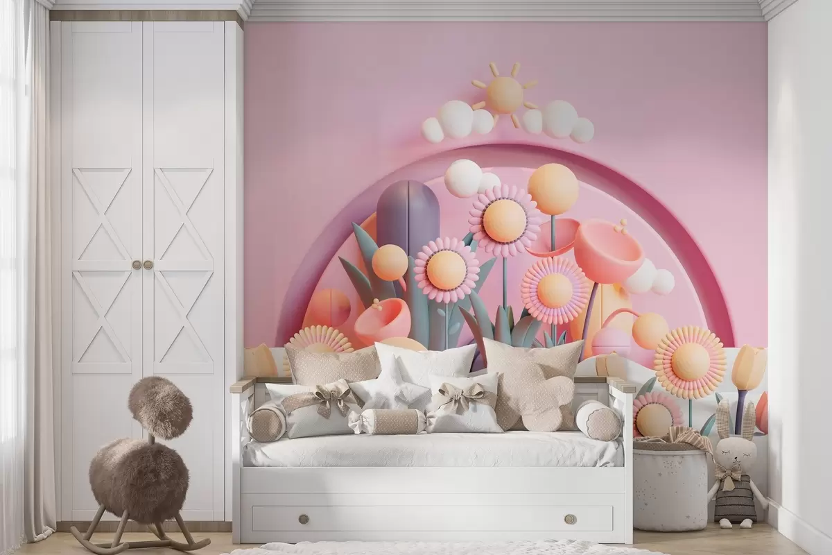 Murais de parede Papel de parede infantil em estilo 3D com flores e nuvens em tons de rosa Nr. w02136