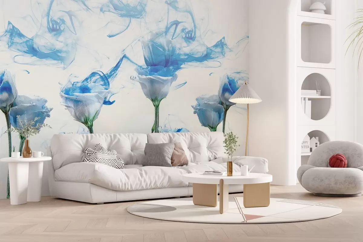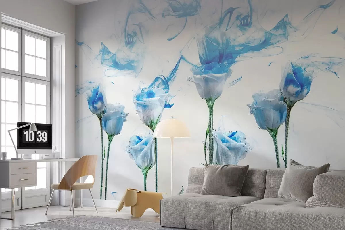 murais de parede Rosas brancas embaixo d'água em um fundo branco com listras de tinta acrílica azul. w02139