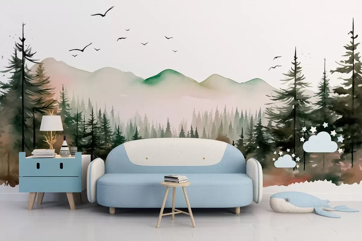 Murais de parede Paisagens de floresta e montanha em aquarela, nas cores verde e rosa Nr. w02150v1