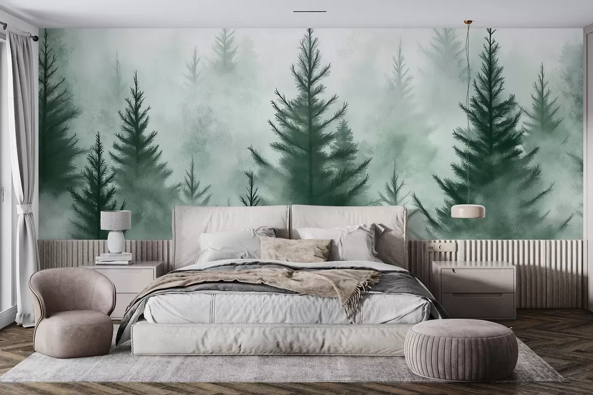 murais de parede Floresta na névoa, pinheiros, aquarela, cores verdes w02152v1