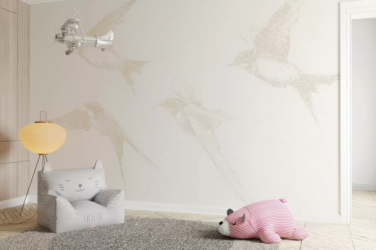 Murais de parede Pássaros voadores, desenho a lápis, minimalismo, cores bege suaves Nr. w02154