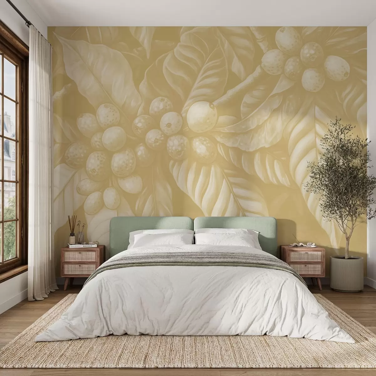 Murais de parede Ramos de cafeeiro com frutas e elementos tropicais em tons de bege Nr. w02209v1