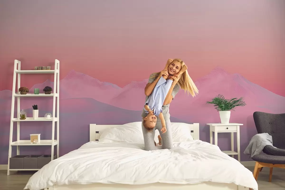 Murais de parede Pôr do sol suave de framboesa contra o pano de fundo das montanhas e do céu Nr. w02234