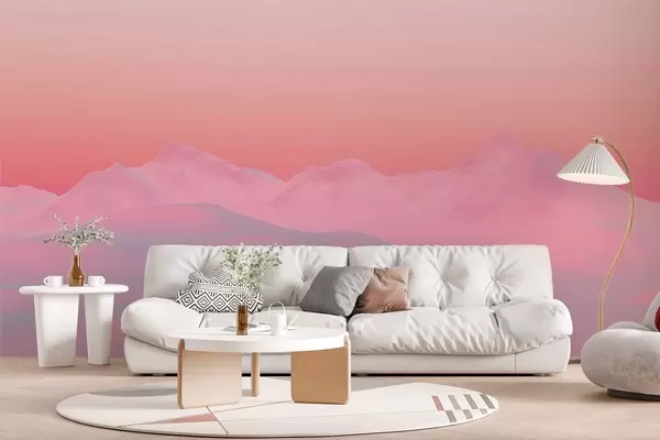 Murais de parede Pôr do sol suave de framboesa contra o pano de fundo das montanhas e do céu Nr. w02234