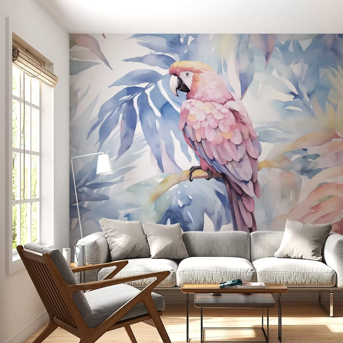 Murais de parede Papagaio rosa sentado em um galho imitação de pintura Nr. w02330