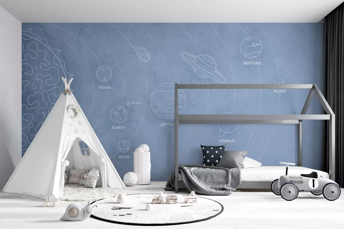 Murais de parede Sistema solar em um estilo minimalista em um fundo azul texturizado Nr. w02344v1