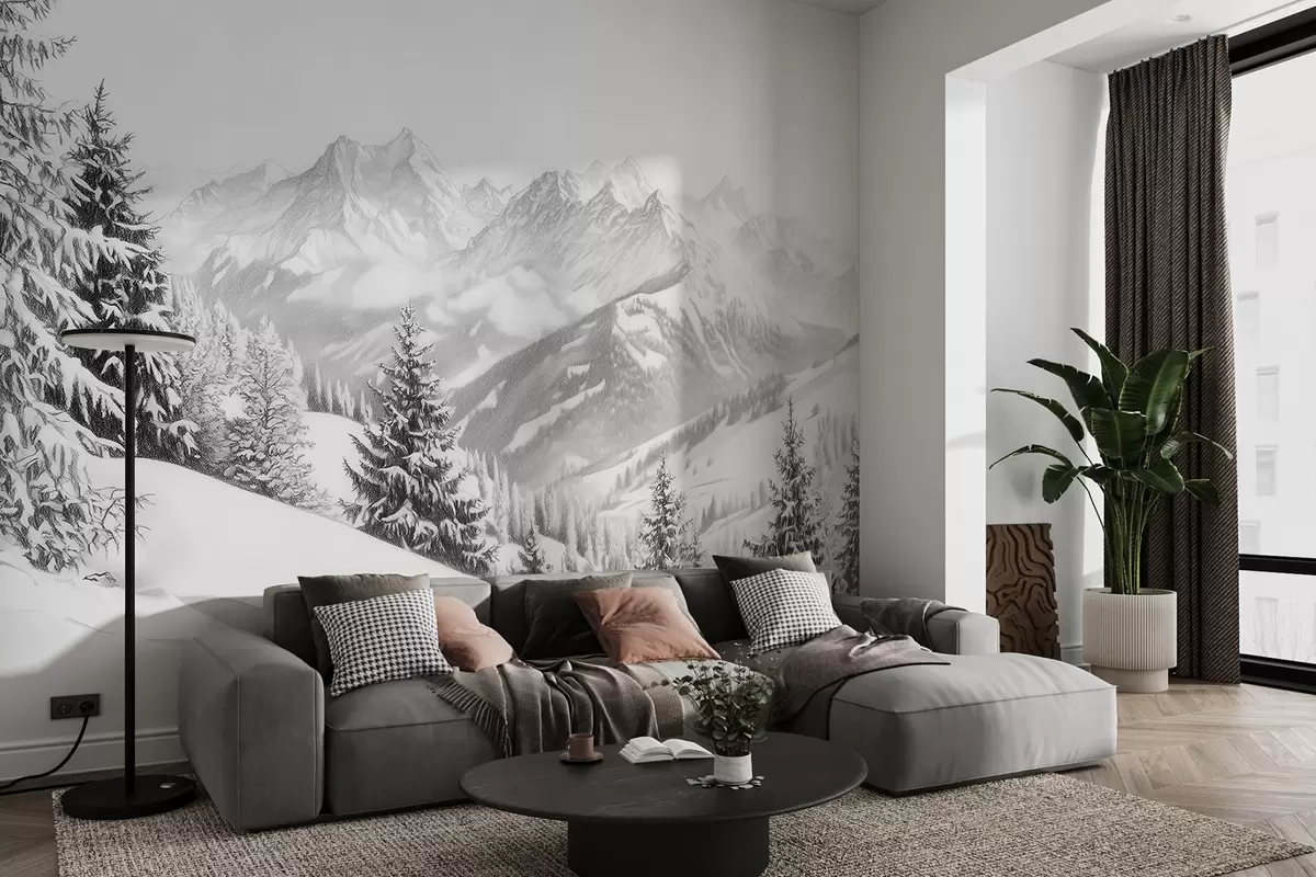 Murais de parede Inverno nas montanhas, floresta, Alpes, desenho a lápis, paisagens naturais Nr. w02353