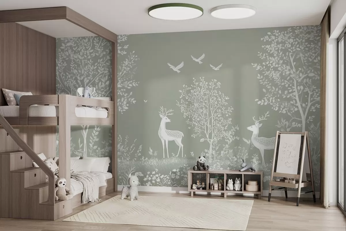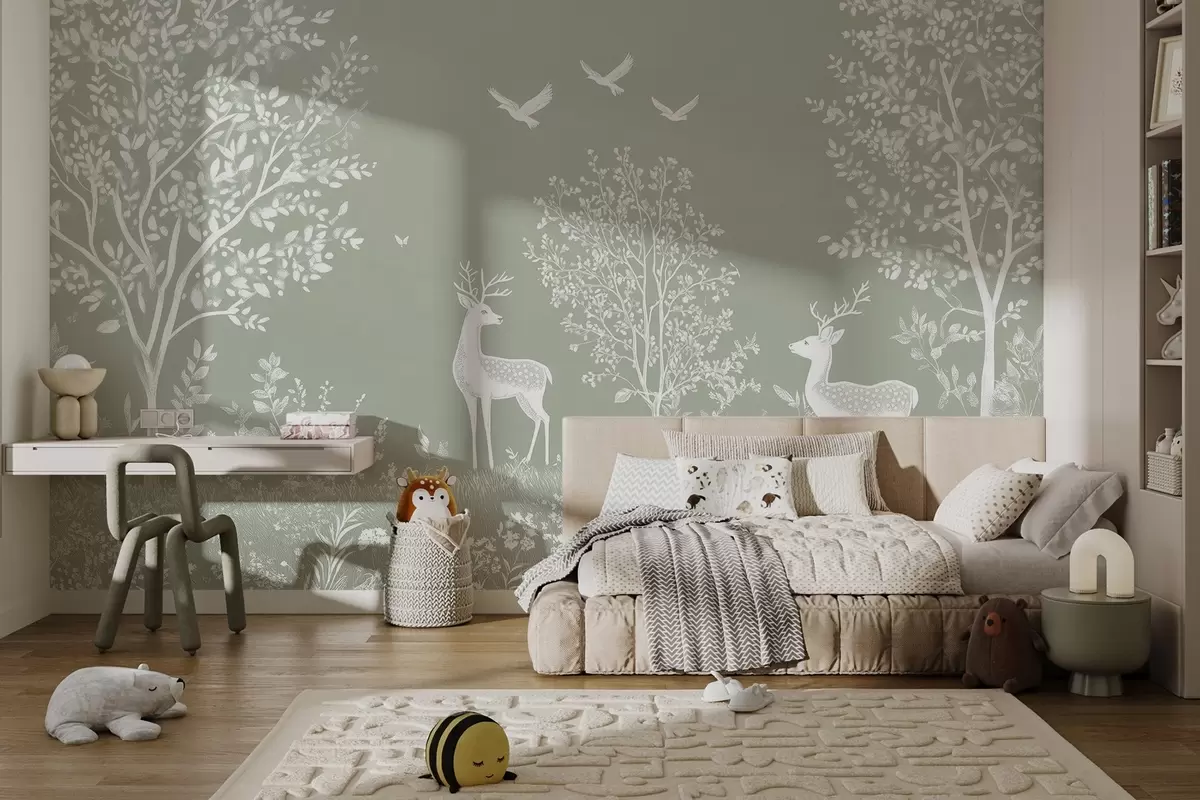 Murais de parede floresta com veados no estilo de um desenho a giz em um fundo verde-oliva Nr. w02444v1