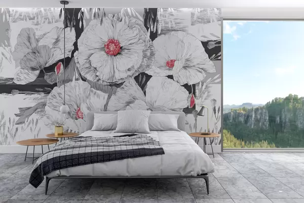 Murais de parede Flores pretas e brancas com centros vermelhos Nr. w02477