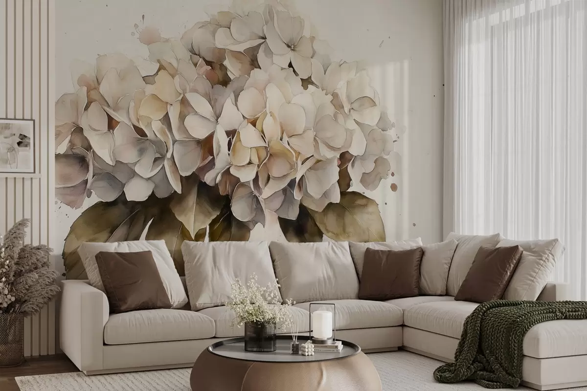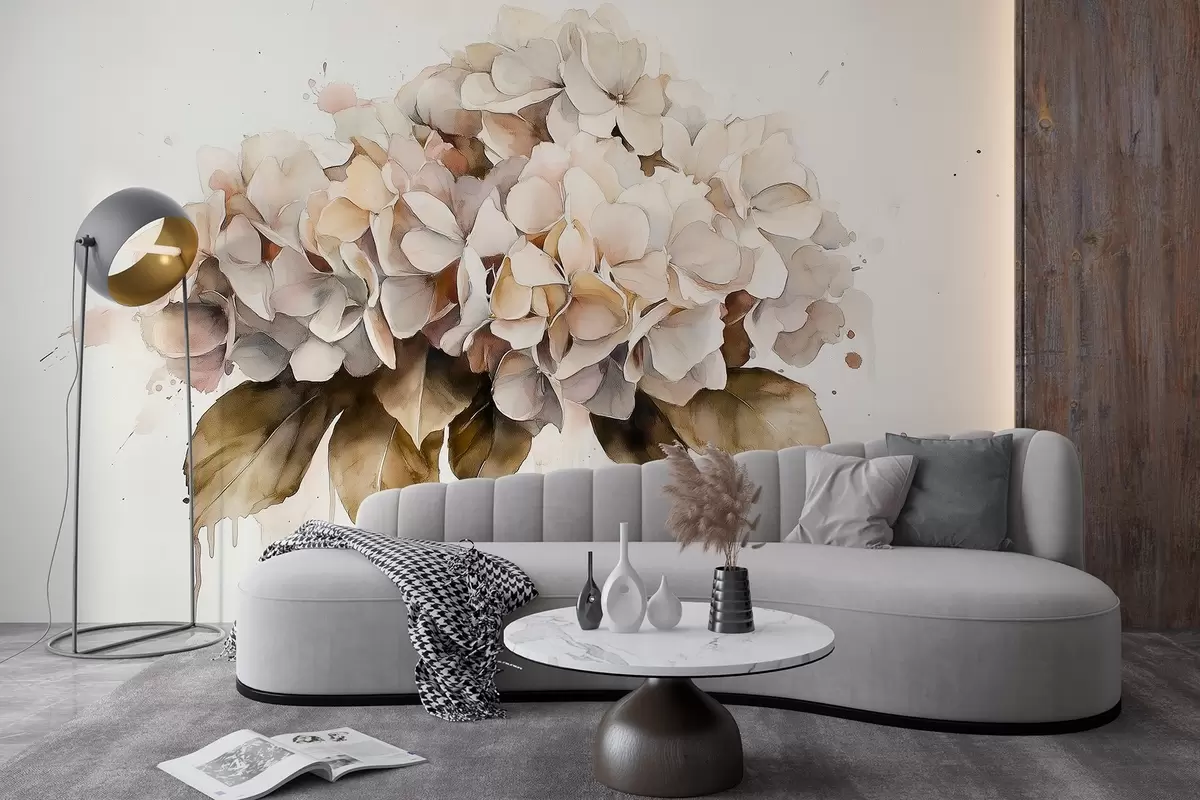 Murais de parede Desenho em estilo aquarela de uma flor de hortênsia, em cores bege Nr. w02485