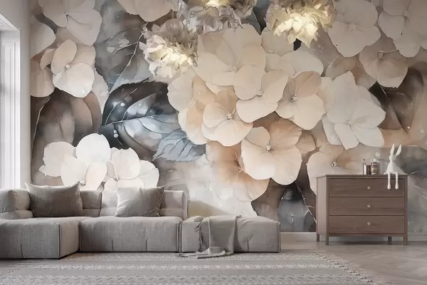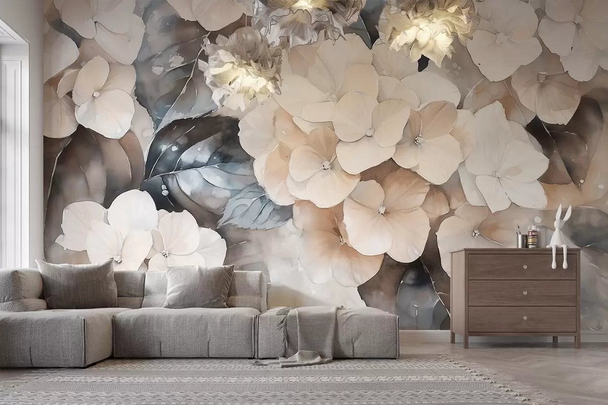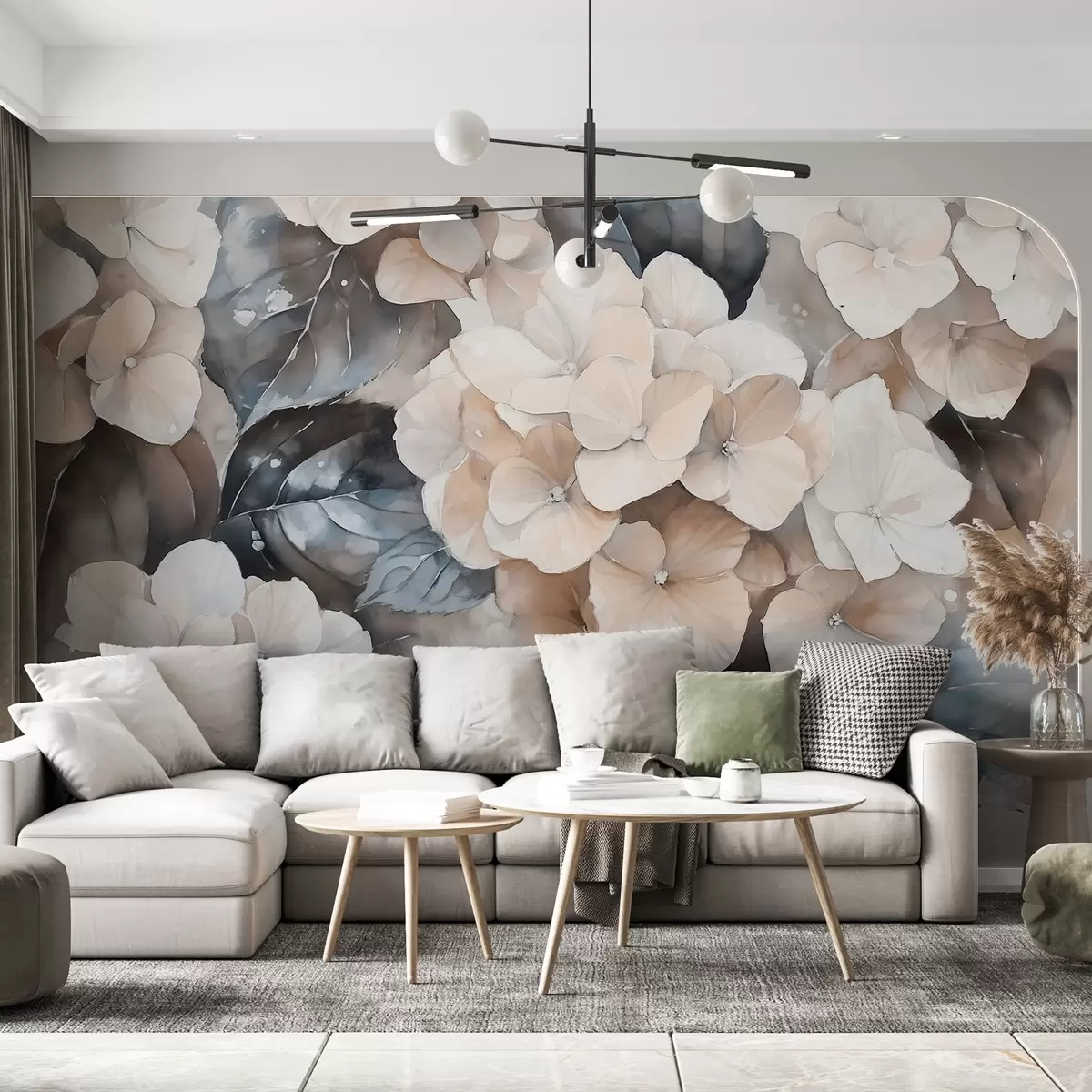Murais de parede Flores de hortênsia, desenho em estilo aquarela, cores bege, floral Nr. w02488