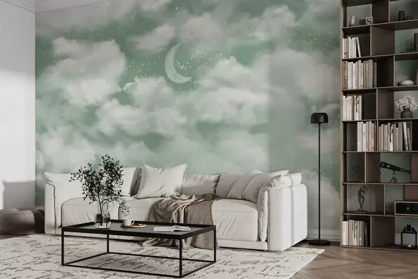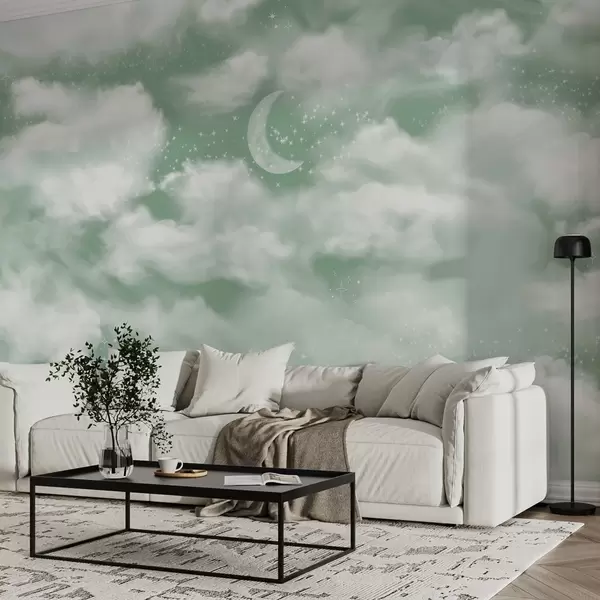 Murais de parede Céu estrelado com lua e nuvens, sonhador, etéreo, cores verdes suaves Nr. w02515v2