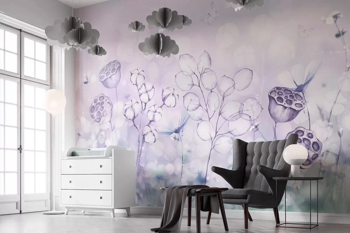 Murais de parede Jardim de flores sonhador, borboleta, flores de algodão, lótus, cores roxas Nr. w02516v1