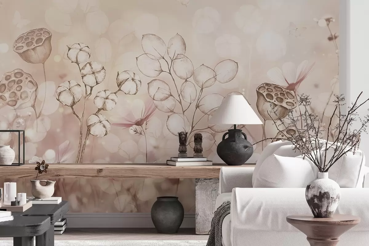 Murais de parede Jardim de flores sonhador, borboleta, flores de algodão, lótus, cores bege Nr. w02516v3