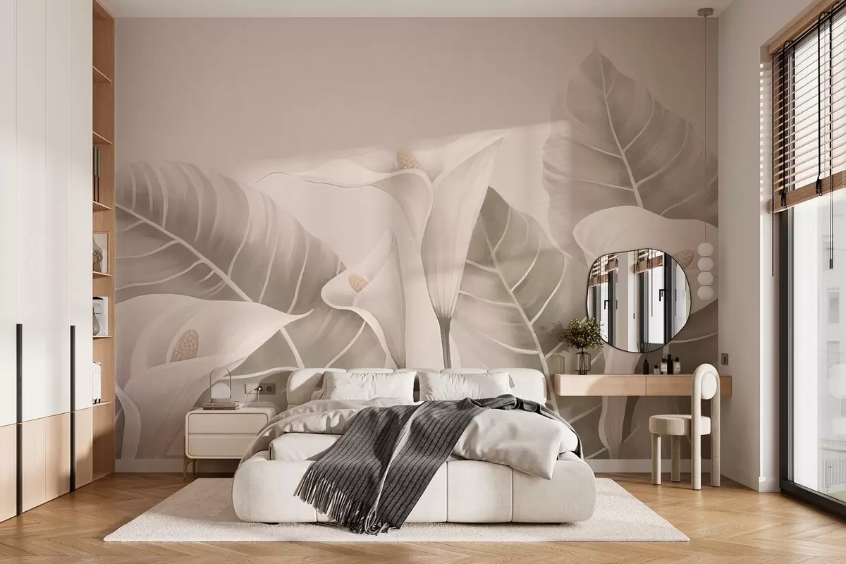 Murais de parede lírios de calla em um fundo de folhas Nr. w02568