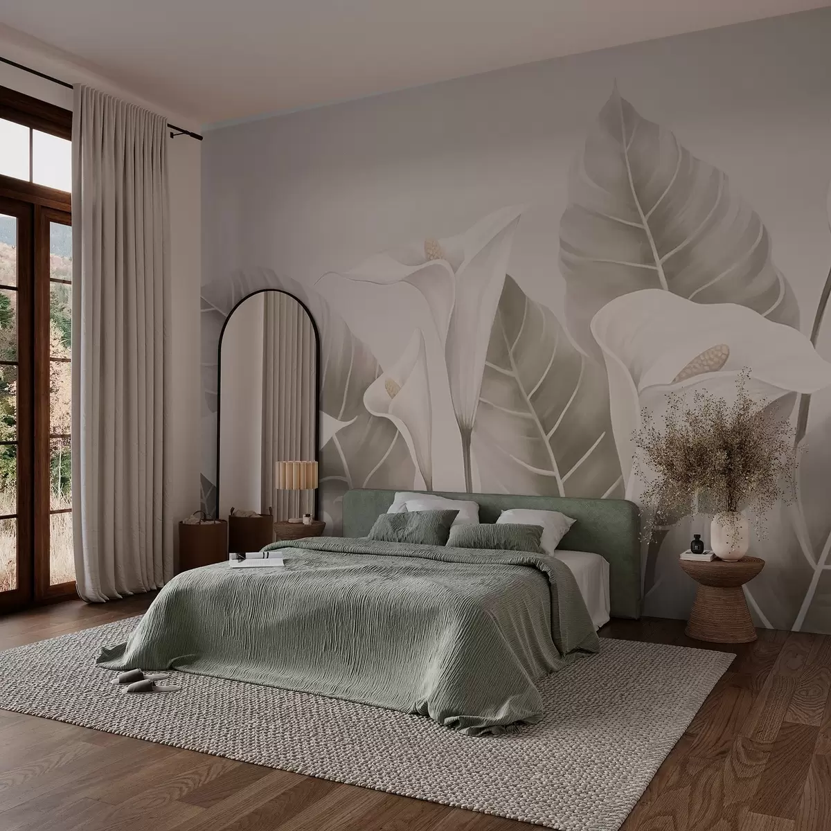 Murais de parede lírios de calla em um fundo de folhas Nr. w02568