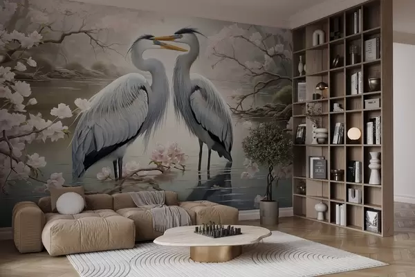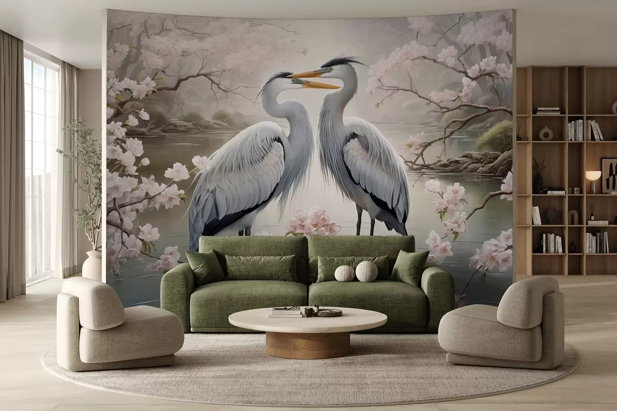 Murais de parede Um par de cegonhas em um jardim florido Nr. w02621