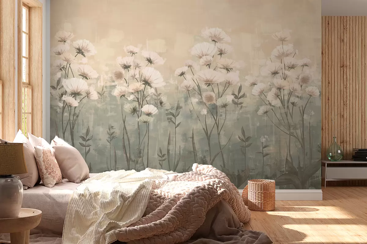 murais de parede Flores silvestres delicadas com efeito de pincelada em amarelo e bege w02629v1