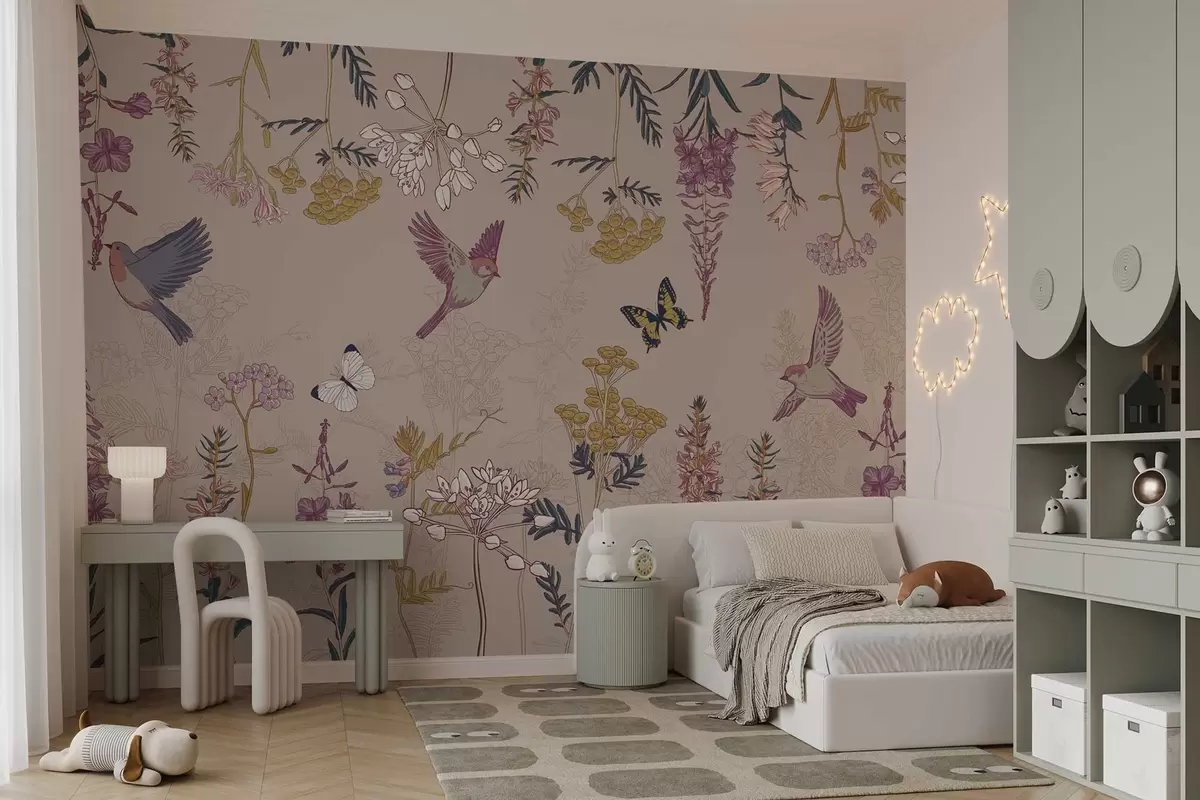 Murais de parede um conjunto de flores silvestres e pássaros em um fundo bege Nr. w02634