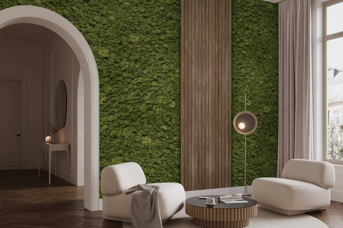 Murais de parede Parede estilo musgo com painel de madeira, cores exuberantes de oliva Nr. w02656v3