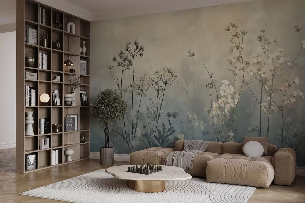 Murais de parede papel de parede em estilo ecológico com flores silvestres e plantas em um fundo texturizado Nr. w02685